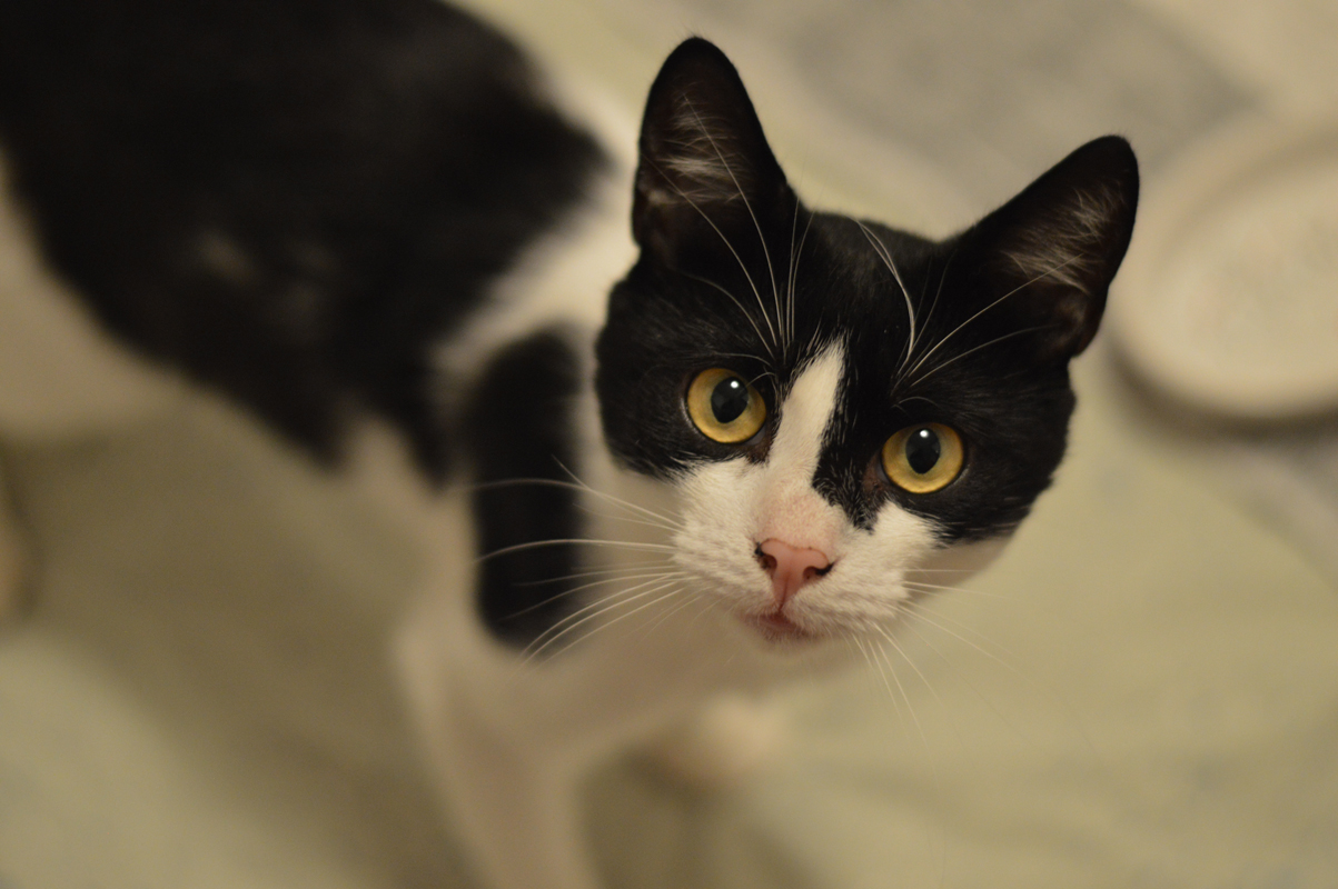 Bajgiel to kotek około 3-letni, śnieżnobiały z szarymi wstawkami. Na początku w schronisku był duszą towarzystwa, zawsze gotowy na głaski, z czasem jednak zaczął zamykać się w sobie i niepokojąco chudnąć.