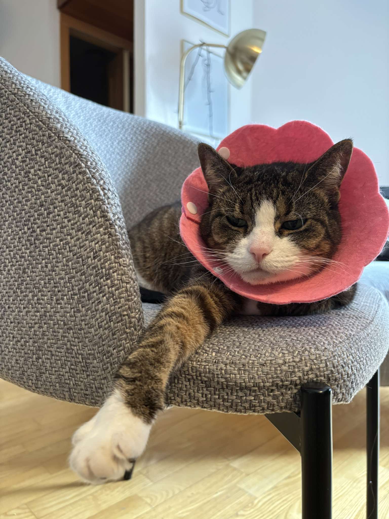 Jagienka bardzo lubi kontakt z człowiekiem. Mimo ograniczającego ruchy kołnierza, ociera się o nogi i domaga głaskania. Jak każdy szanujący się kot, Jagienka ma też oczywiście swoje zdanie w relacjach kocio-ludzkich, ale wyraźnie komunikuje, kiedy potrzebuje więcej przestrzeni. Dobrze znosi
