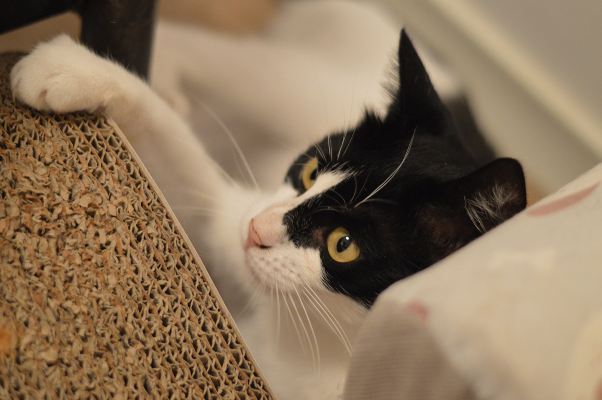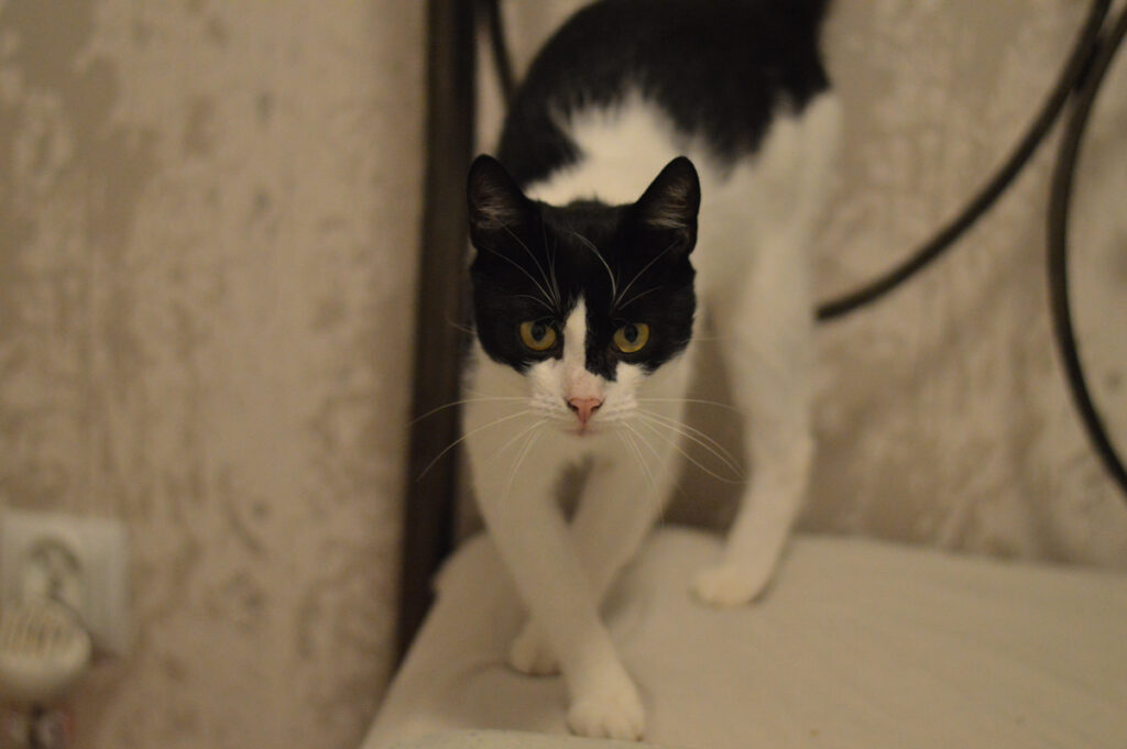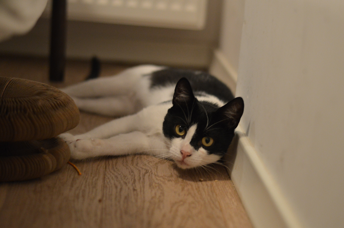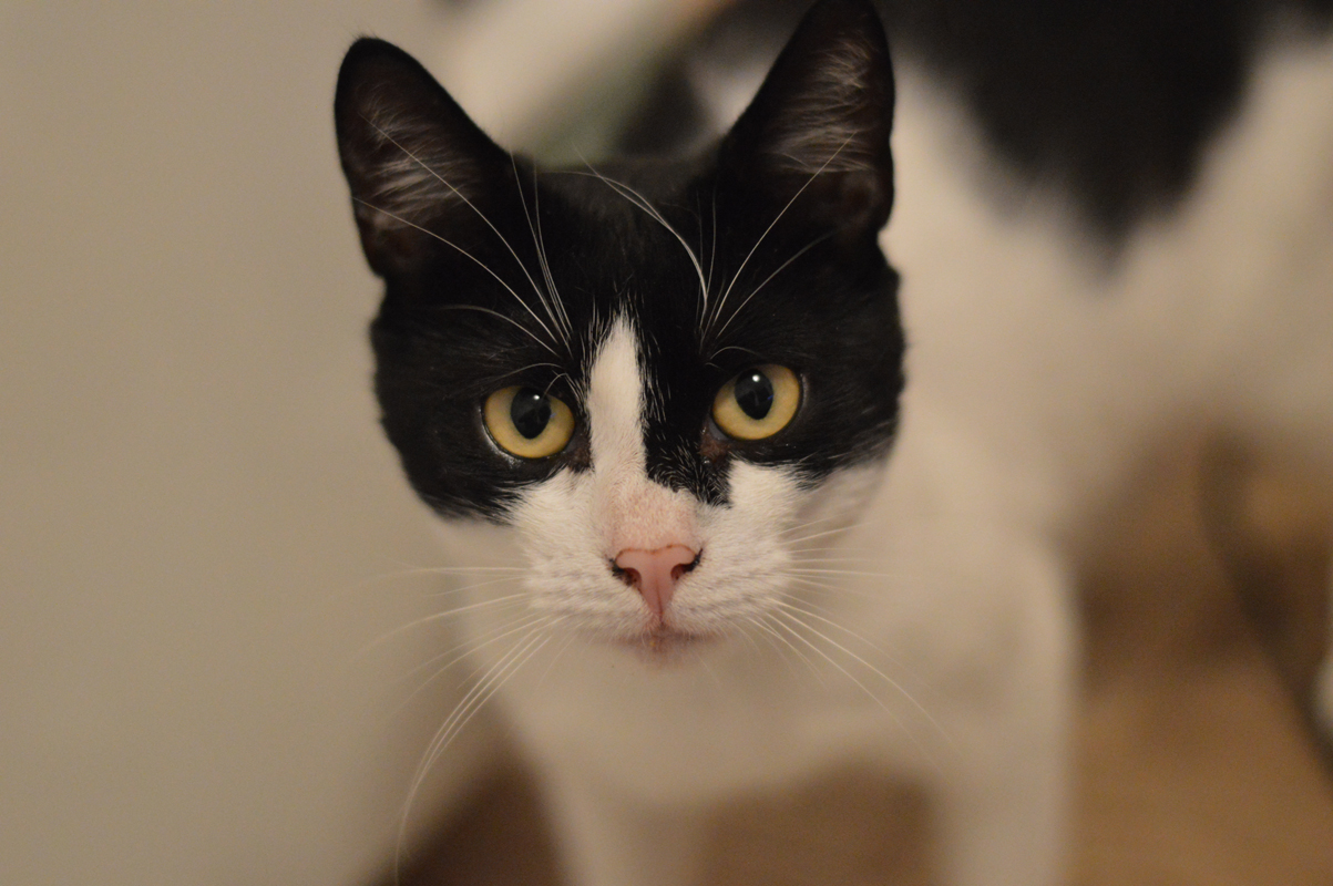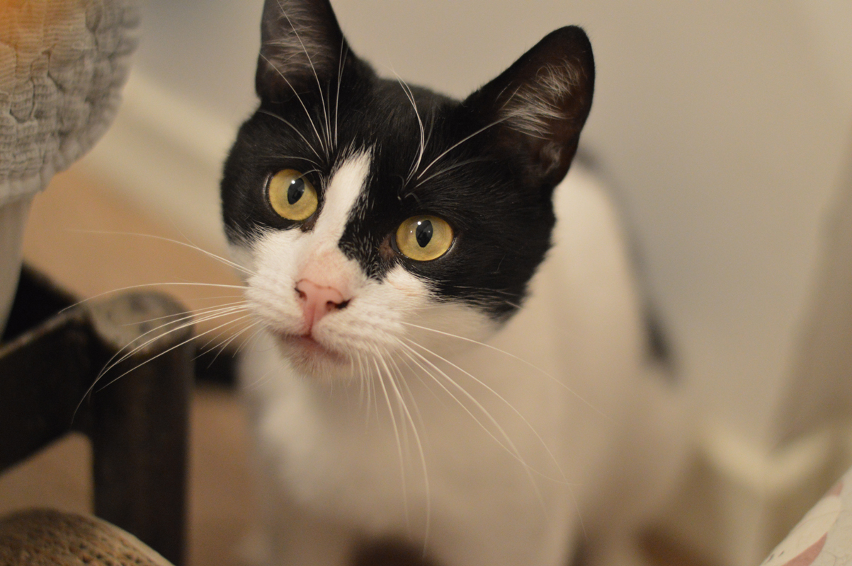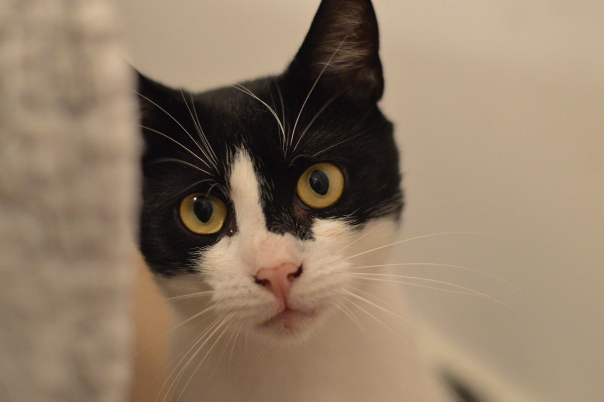 Przyszły dom powinien to brać pod uwagę, bo niewybawiony Sandacz to sfrustrowany Sandacz, który potrafi podgryzać, żeby zwrócić na siebie uwagę. Kocurek jest bezproblemowy jeśli chodzi o wizyty u weterynarza i podawanie leków. Sandacz jest bardzo ciekawi umaszczony. To taka typowa krówka z „motywem na twarzy”, co w przypadku Sandacza oznacza Batmana lub Zorro w zależności, z której strony się spojrzy. Powiedzmy to uczciwie, chłopak się maskuje 😉