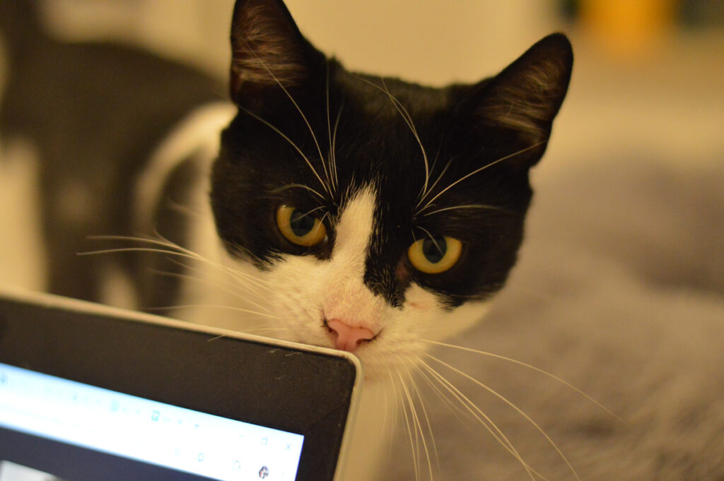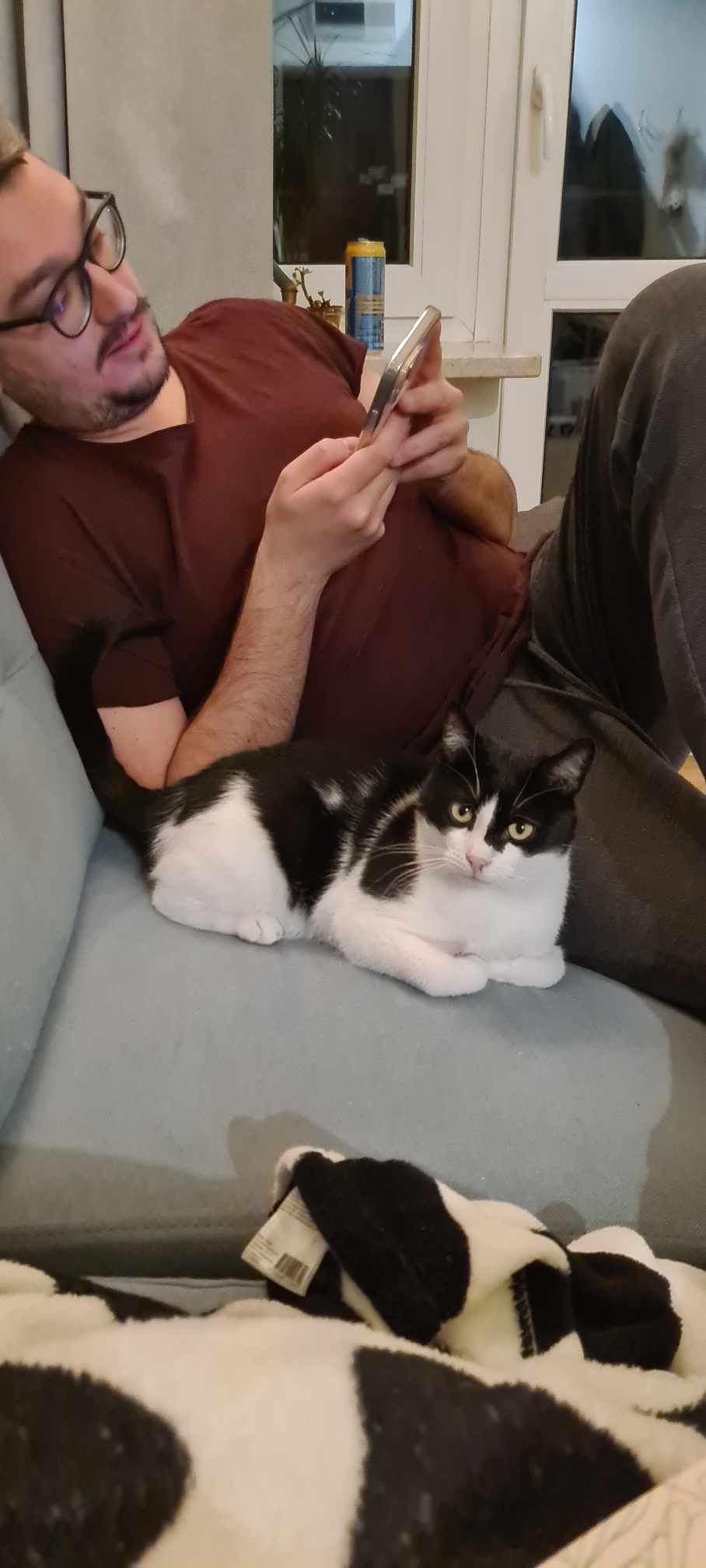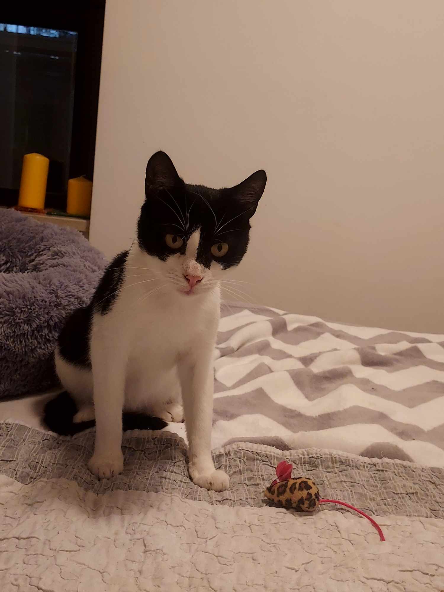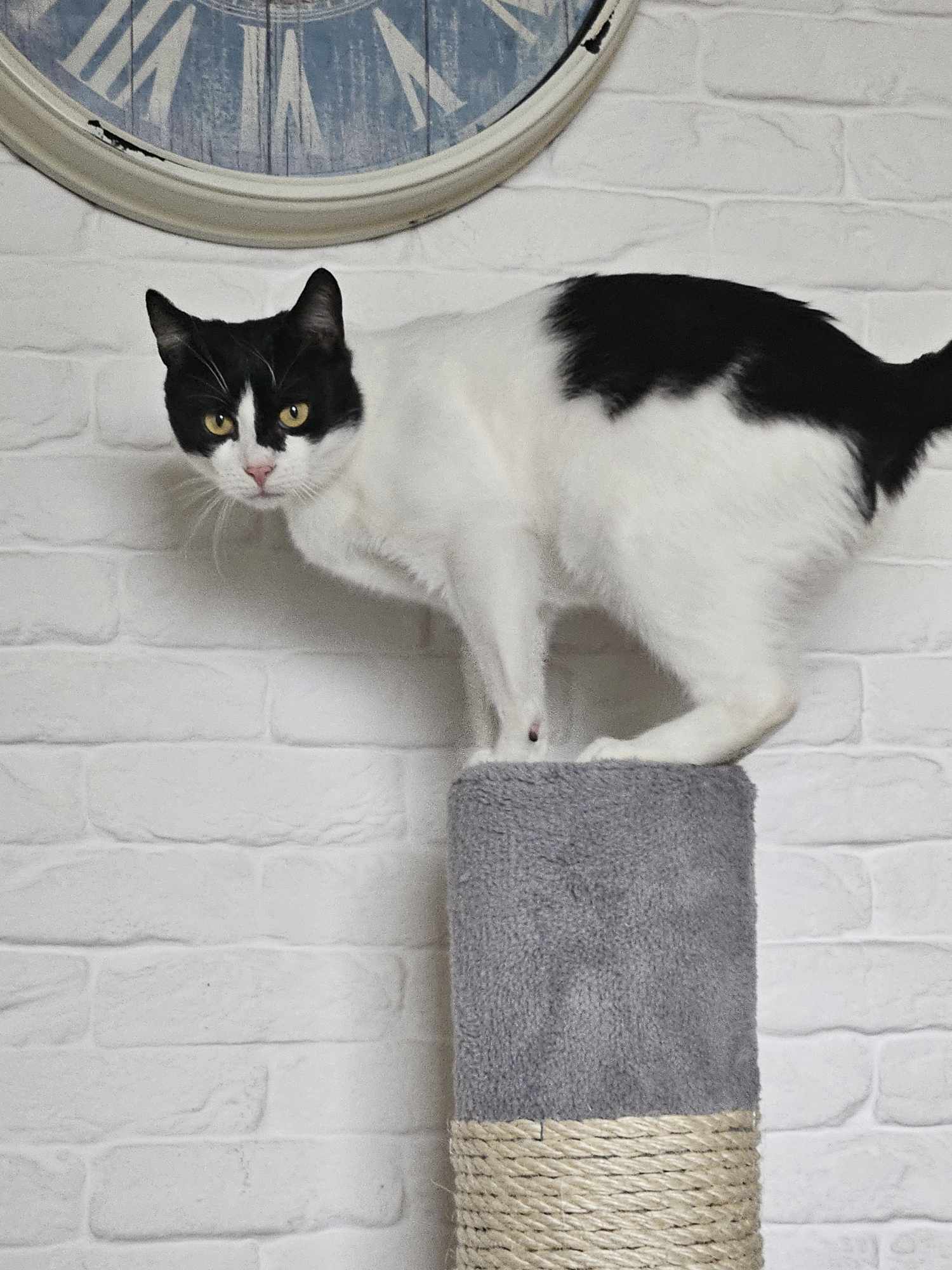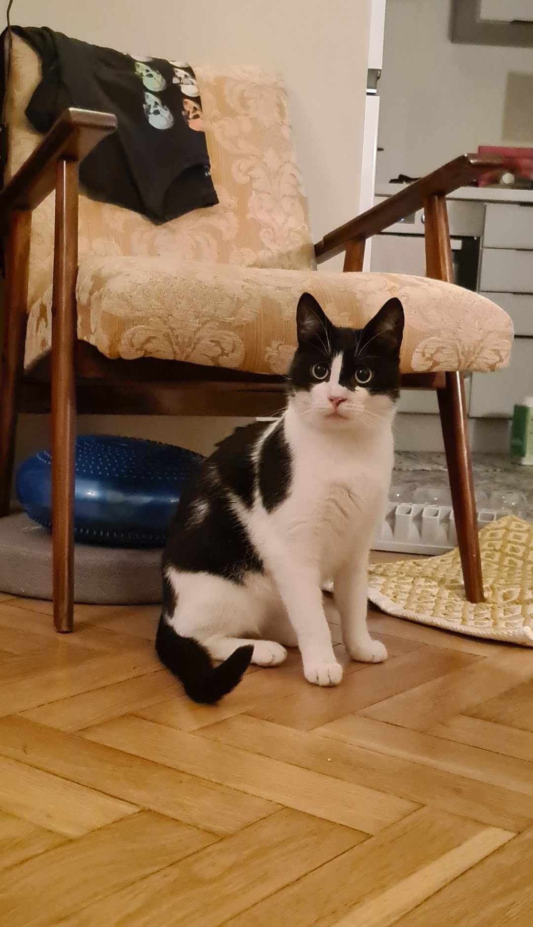 Przyszły dom powinien to brać pod uwagę, bo niewybawiony Sandacz to sfrustrowany Sandacz, który potrafi podgryzać, żeby zwrócić na siebie uwagę. Kocurek jest bezproblemowy jeśli chodzi o wizyty u weterynarza i podawanie leków. Sandacz jest bardzo ciekawi umaszczony. To taka typowa krówka z „motywem na twarzy”, co w przypadku Sandacza oznacza Batmana lub Zorro w zależności, z której strony się spojrzy. Powiedzmy to uczciwie, chłopak się maskuje 😉