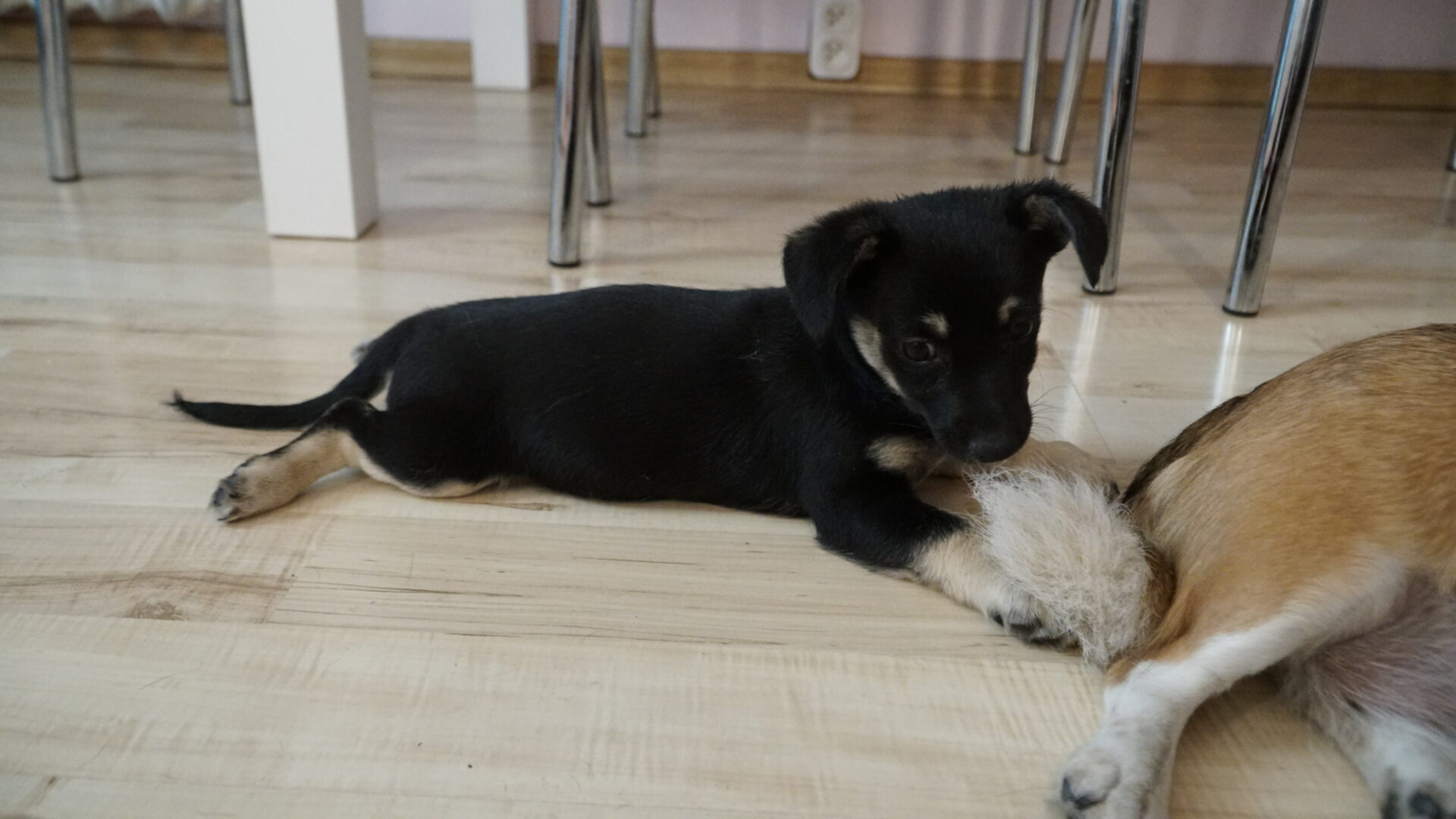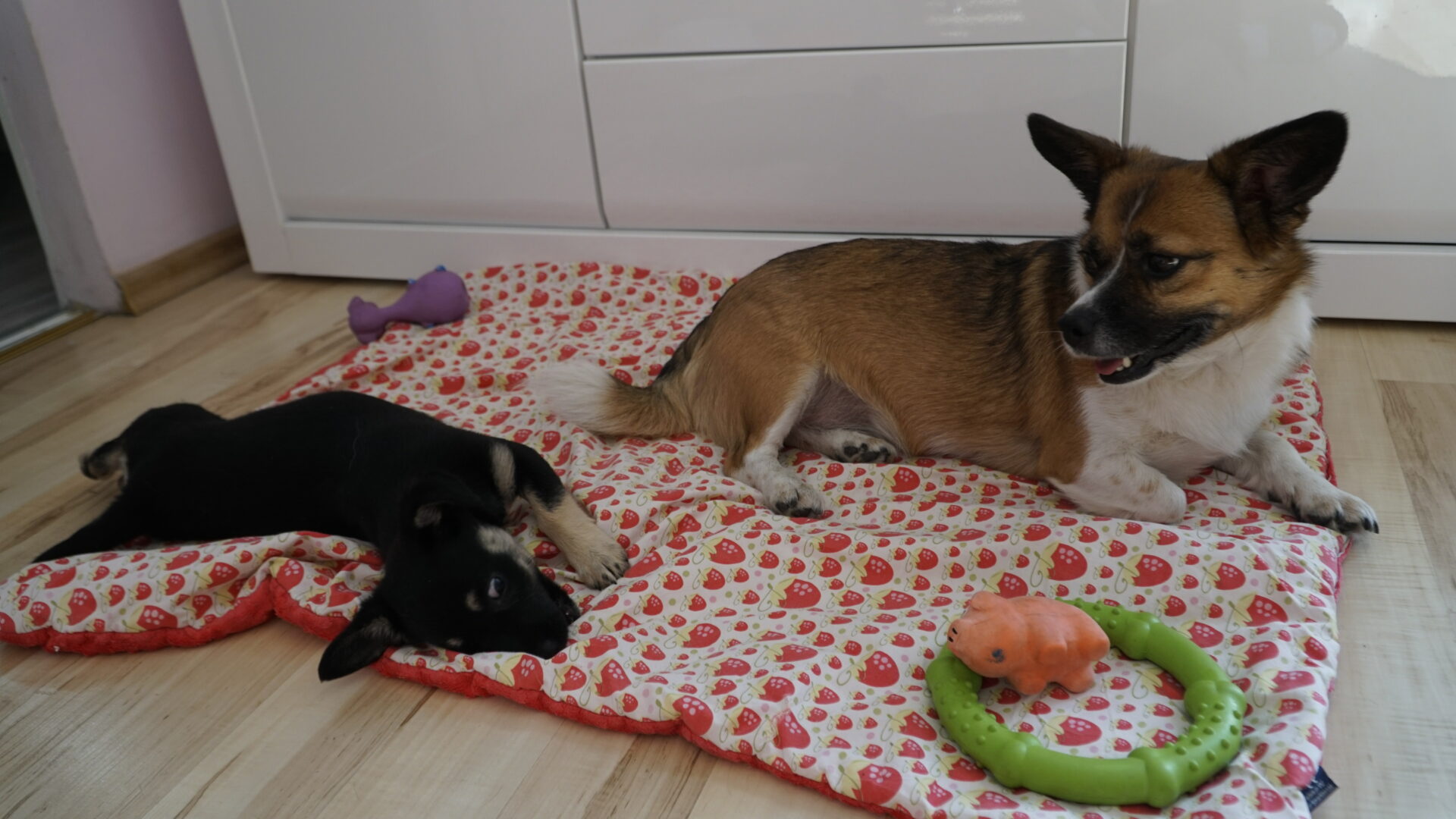 Jadzia miała problemy zdrowotne (zapalenie migdałków, jelit i żołądka). Czuje się już znakomicie, jest po pierwszych szczepieniach i zaczęła wychodzić na spacery. Póki co uczy się załatwiania na zewnątrz, w domu potrzeby fizjologiczne załatwia na matę, sporadycznie zdarzają jej się wpadki, np. gdy zabawa z kumplami jest zbyt fajna, żeby tracić czas na udanie się „na stronę” 😉