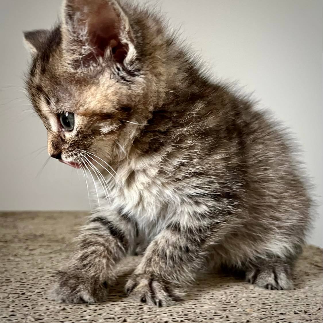 Tikka – ma przepiękne, puszyste futerko w trzech kolorach i świetnie wychodzi na zdjęciach Wyróżnia ją uroczy czarny przecinek w nosku. Lubi leżeć brzuszkiem do góry, chociaż najwięcej czasu spędza na zabawach z rodzeństwem.